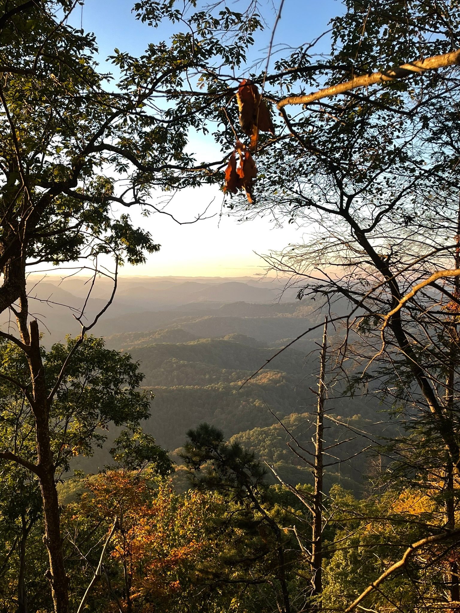 But the surrounds were stunning that first week of last October. Right outside our door was a dramatic mountainside painted autumn. When we checked in, the clerk told us about a lookout where we could watch the sun set over the valley, then excused herself to go pick up a pizza for some construction workers staying that night who didn’t have their own car.