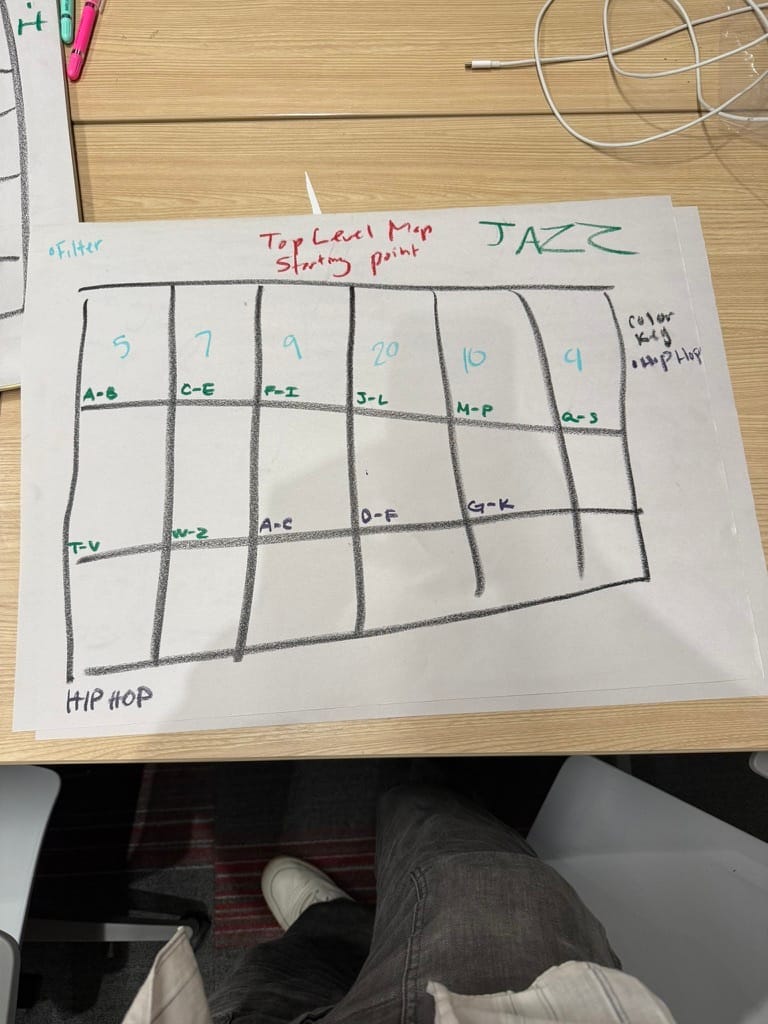 Perhaps you’ve noticed something is missing from this design. It was certainly on my mind the whole time. During the first workshop session, we brainstormed ideas about how software could better what they do—and social media just was not coming up. They mentioned an improved web radio stream, something that helped them find new music in genres they love, tools to help them explore WMUA’s stacks.